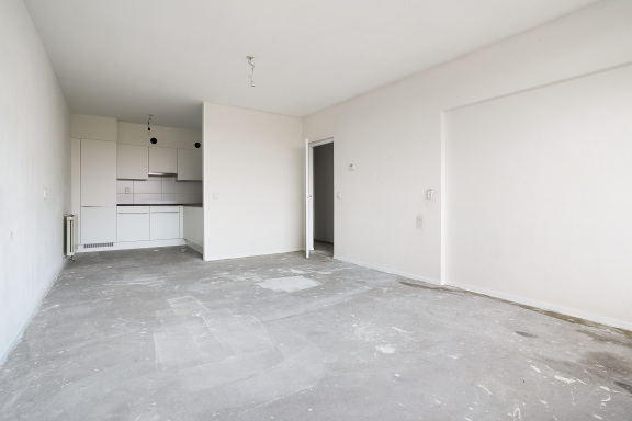 Een ruime woonkamer met een half open keuken. De woonkamer biedt toegang tot het balkon.
