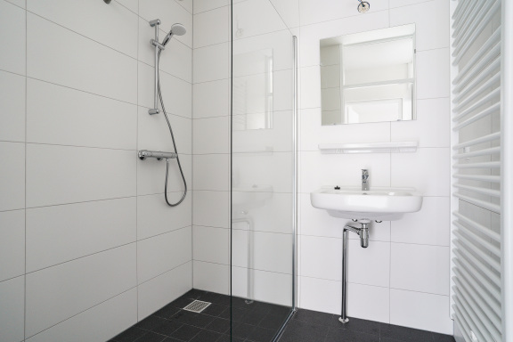De badkamer wordt gerenoveerd. De nieuwe badkamer is voorzien van een douche, wastafel en designradiator.
