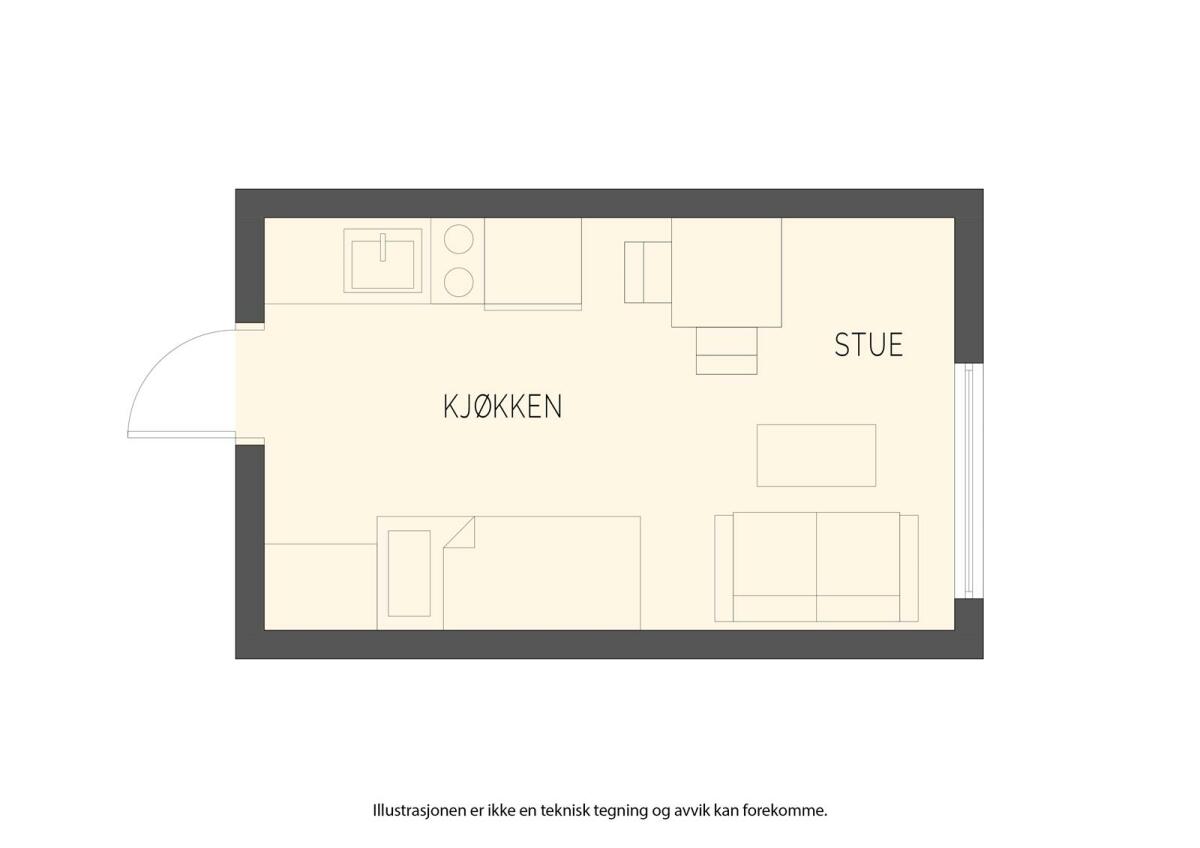 Indre rom: Oppholdsrom med hybelkjøkken. Leiligheten er møblert.
