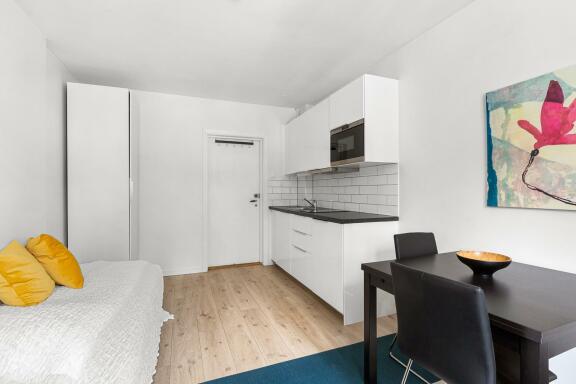 Indre rom: Oppholdsrom med hybelkjøkken. Leiligheten er møblert.