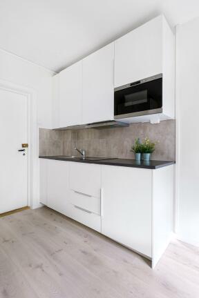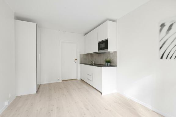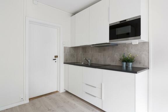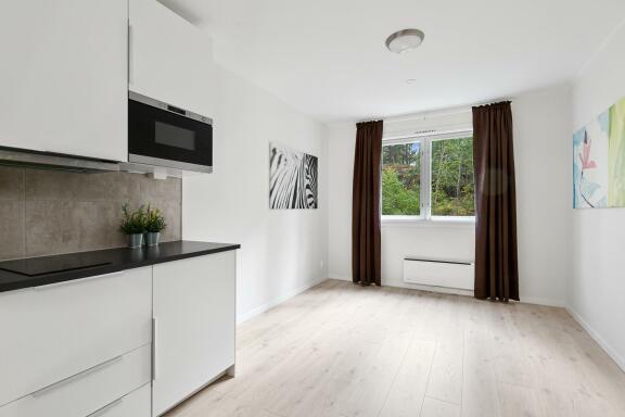 Oppholdsrom med kjøkkenkrok. Kjøkkenet har hvitevarer som koketopp, mikro og kjøleskap.