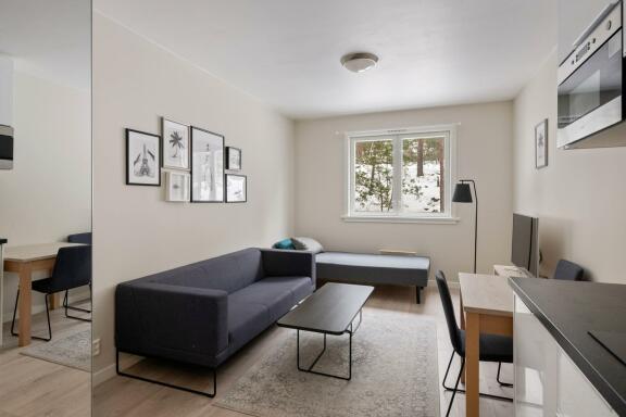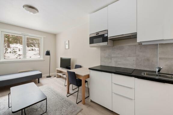 Hybelleilighet med hybelkjøkken og felles bad. Bygningen er omringet av grøntarealer og ligger høyt i sine omgivelser med flott utsikt over Oslofjorden. Her har du alt av service- og kollektivtilbud i nærheten. Gården ligger også nærme Sunnaas sykehus. Leiligheten har tilgang til felles bad og toaletter i samme etasje samt et stort og godt utstyrt felles kjøkken.