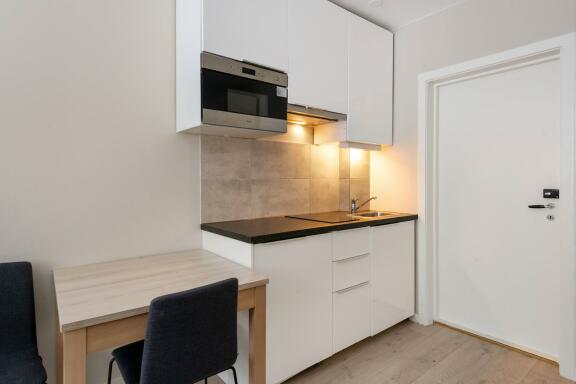 Oppholdsrom med hybelkjøkken. Hvitevarer som mikro, koketopp og kjøl-/fryseskap.