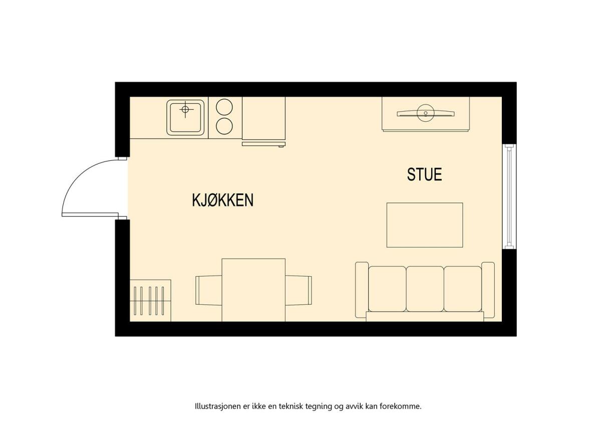 Oppholdsrom med kjøkken. Felles kjøkken i samme etasje med stekemuligheter. Kjøkken i leilighet inneholder kjøl-/fryseskap, koketopp og mikrobølgeovn.