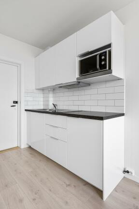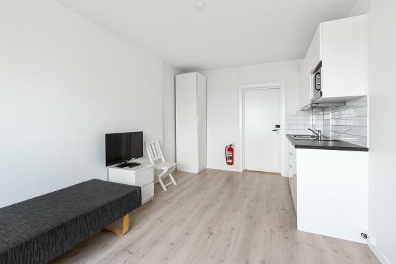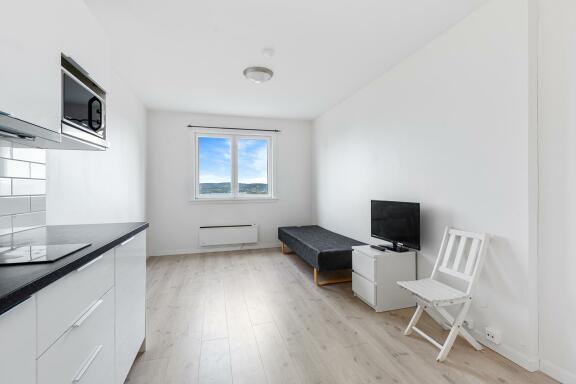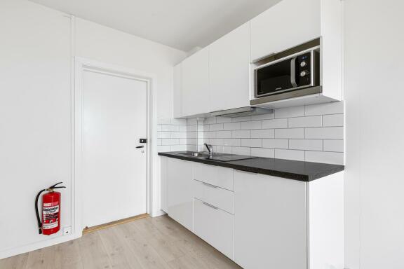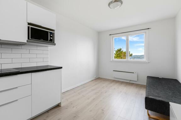 Oppholdsrom med kjøkken. Felles kjøkken i samme etasje med stekemuligheter. Kjøkken i leilighet inneholder kjøl-/fryseskap, koketopp og mikrobølgeovn.