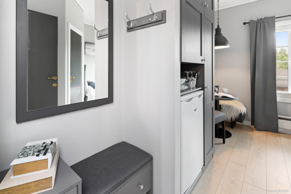 Moderne, fullt møblert hybel leilighet med smarte løsninger for maksimal utnyttelse av plassen. Gården er totalrenovert i 2015, og holder en høy standard. Leiligheten inneholder stue og bad, som til sammen utgjør et flott oppholdsrom. Perfekt leilighet for en person.