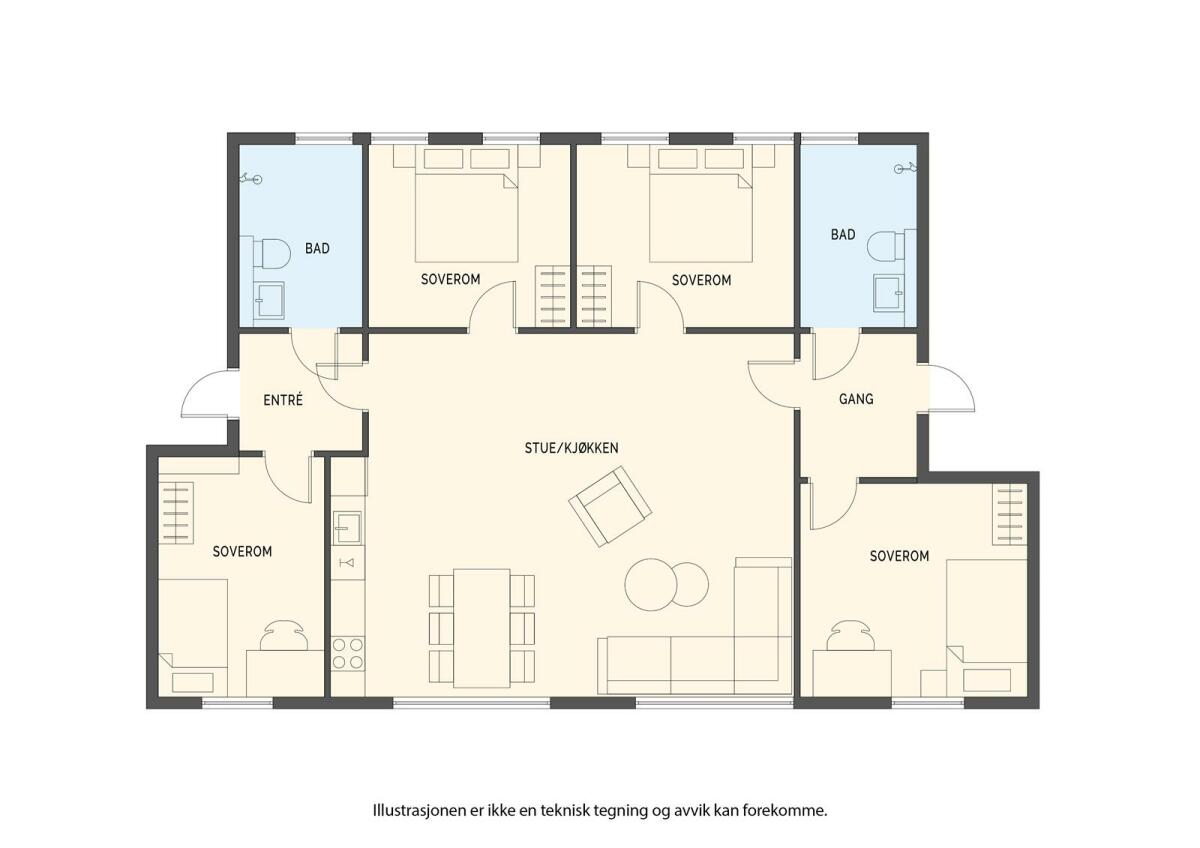 Entré, stue med utgang, kjøkken, 4 soverom og 2 bad.