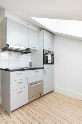 Kjøkken: Kjøkkeninnredning med integrerte hvitevarer; platetopp, stekeovn/mikrobølgeovn, kjøleskap, oppvaskmaskin og vifte.