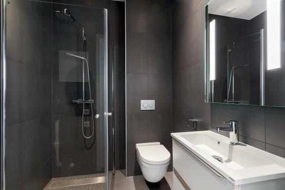 Bad: Fliser på gulv og vegger med dusjdører i glass. Dørene kan slås inn i dusjen for maksimal utnyttelse av gulvareal. Varmekabler og opplegg for vaskemaskin.
