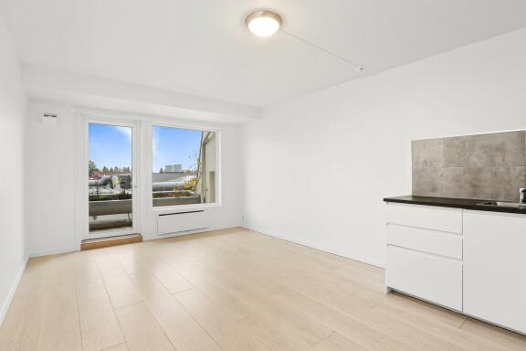 Entré, stue med åpen kjøkkenløsning, balkong.