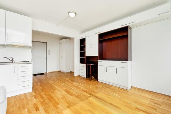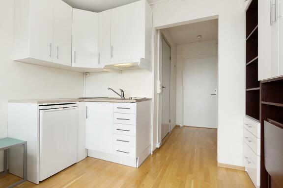 Arealeffektiv og romslig 1-roms hybelleilighet med smarte løsninger for maksimal utnyttelse av plassen. Leiligheten ligger i byggets toppetasje med heisadkomst. Leiligheten har eget kjøkken og bad, og er innredet med garderobeskap. Kjøkkenet er et hybelkjøkken med koketopp, kjøleskap, oppvaskmaskin og mikrobølgeovn.