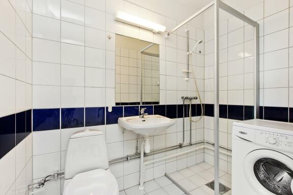 Lekkert, flislagt bad med dusjnisje og servant med servantskap. Vaskemaskin medfølger.