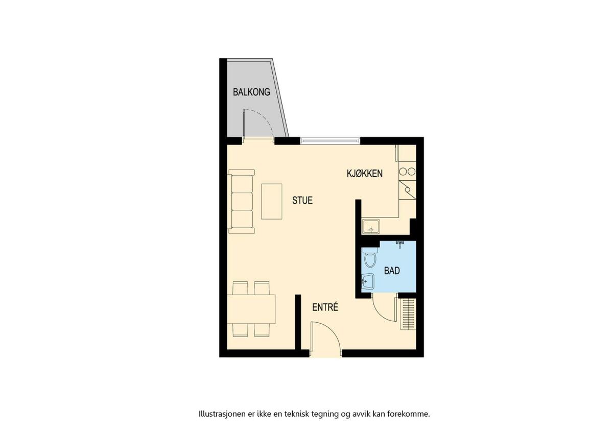 Entré, stue med åpen kjøkkenløsning, sovealkove, bad, balkong.