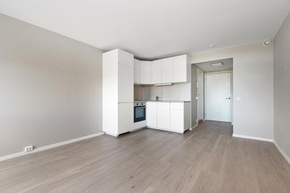 Entré, oppholdsrom med åpen kjøkkenløsning, bad og balkong.