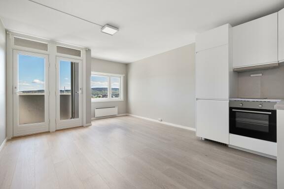 Lys Leiligheten nyere gulv, bad og kjøkken. 1-roms leilighet beliggende på et høydedrag som gir flott utsikt ifra leiligheten. Leiligheten har en smart planløsning med oppholdsrom med åpen kjøkkenløsning, bad og balkong.