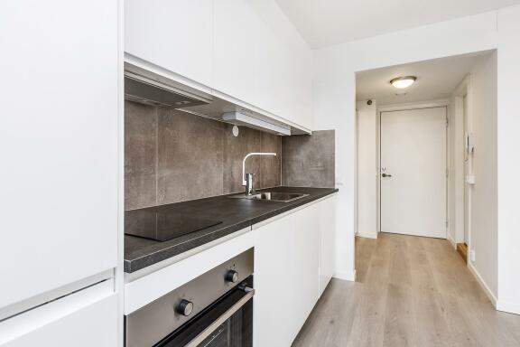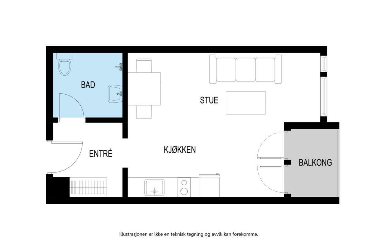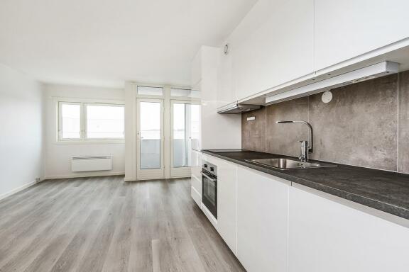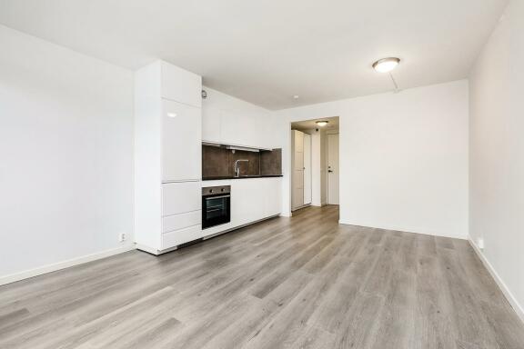 Entré, oppholdsrom med åpen kjøkkenløsning, bad og balkong.