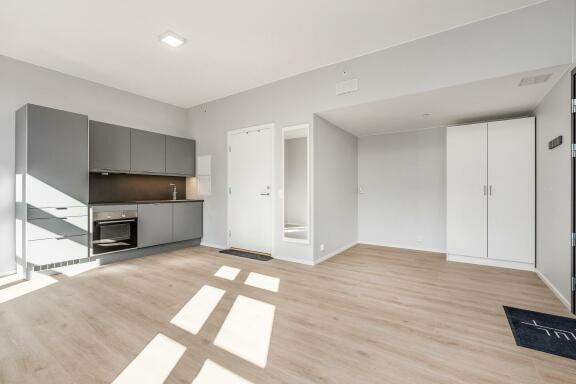 Entré med garderobeskap, stue med åpen kjøkkenløsning og bad.