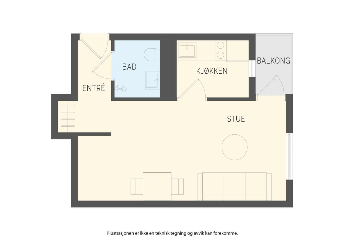 Entré, stue med utgang til balkong, separat kjøkkenløsning, bad.