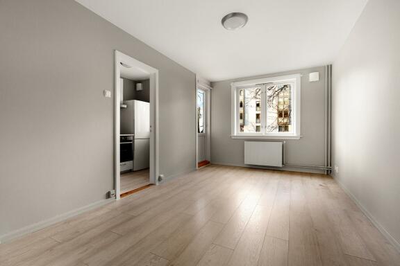 Entré, stue med utgang til balkong, separat kjøkkenløsning, bad.