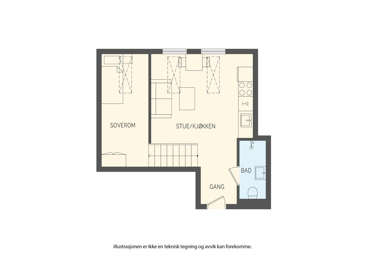 Entré med garderobeskap, stue med åpen kjøkkenløsning, soverom, hems og bad.