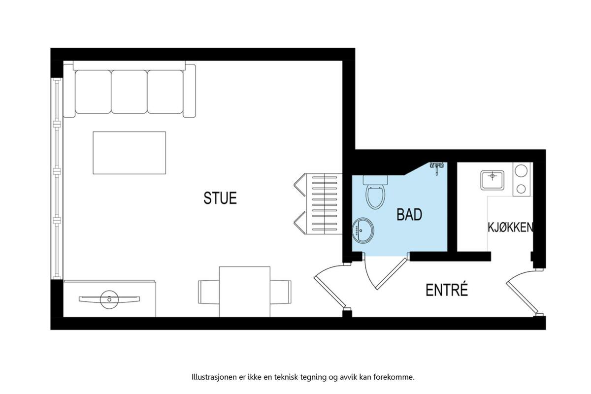 Entré, stue, separat kjøkken, bad