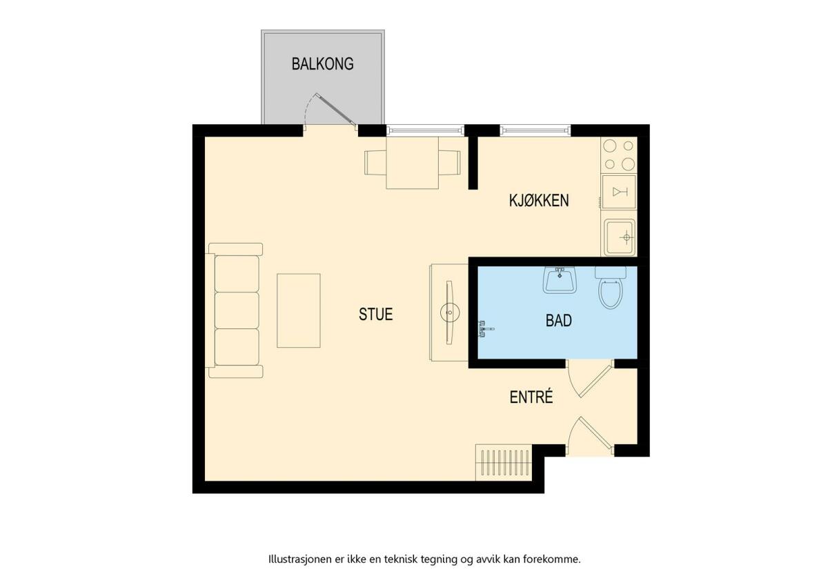 Entré, stue med utgang til balkong, separat kjøkkenløsning, bad.