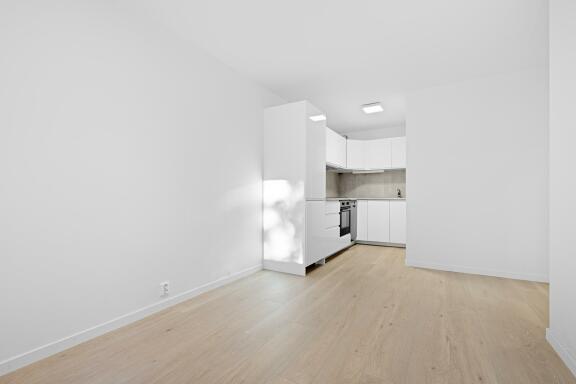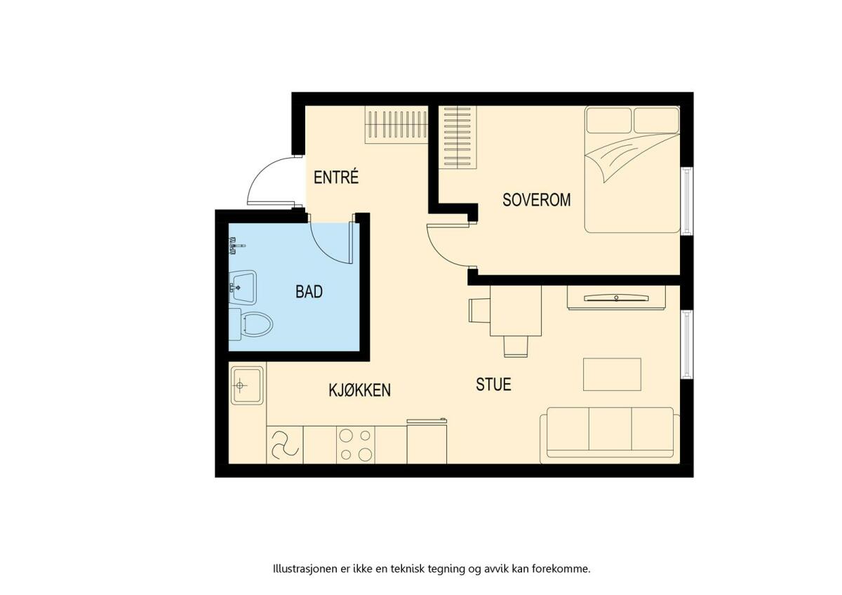 Entré, stue med åpen kjøkkenløsning, bad, soverom og oppholdsrom.
