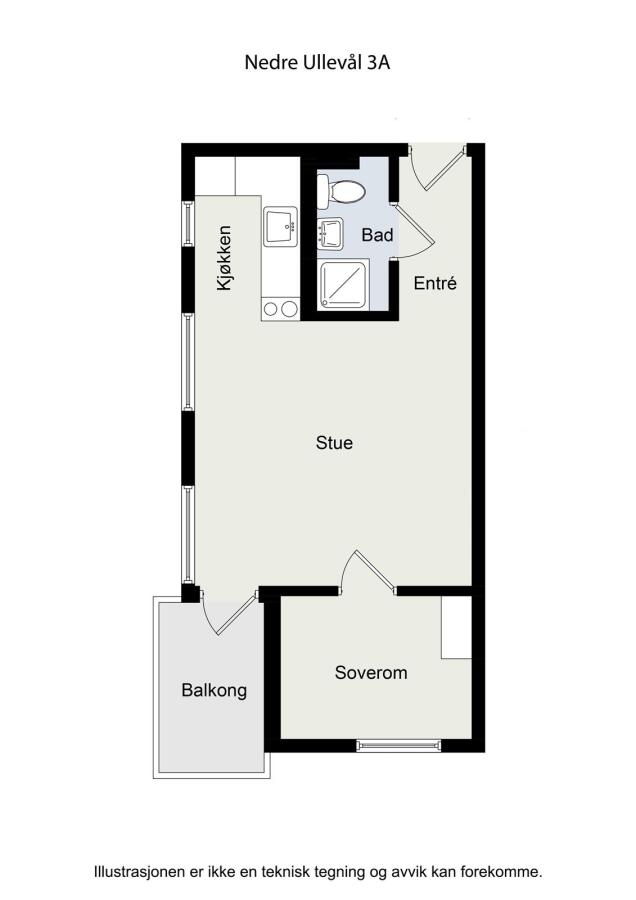 Entré, stue med utgang til balkong, separat kjøkken, bad og soverom.