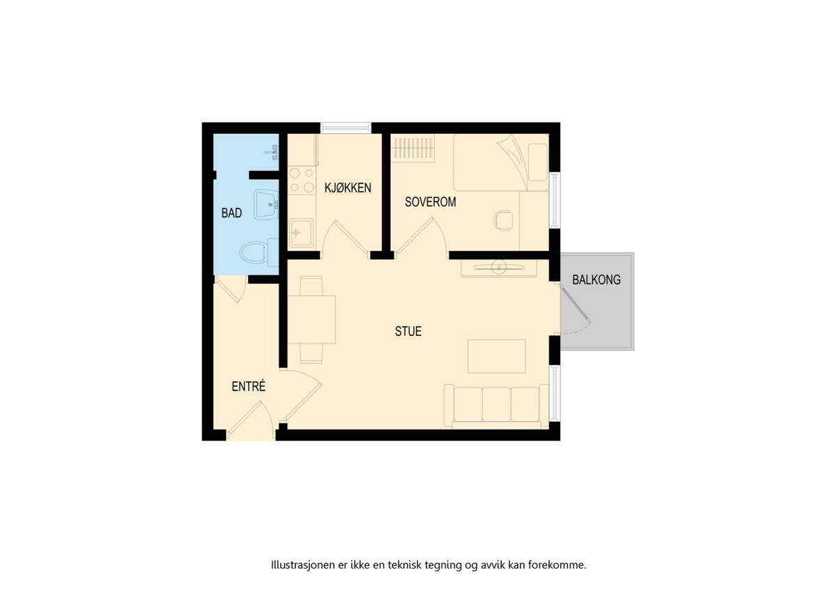 Entré, stue med utgang til balkong, separat kjøkken, bad og soverom.