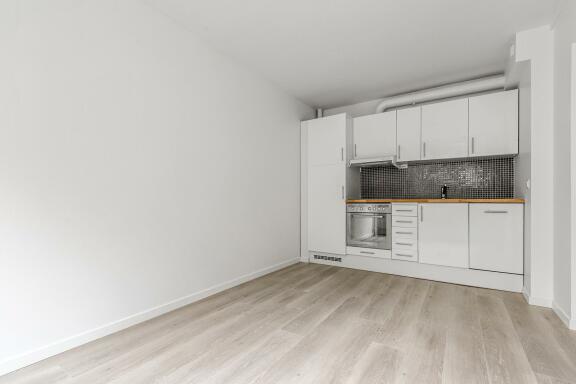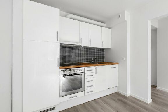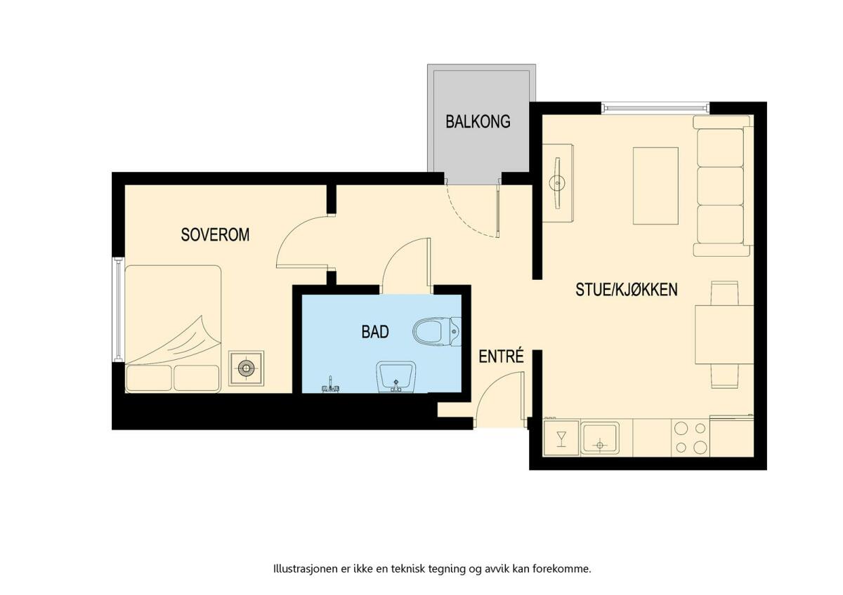 Entré, stue med åpen kjøkkenløsning, bad med opplegg for vaskemaskin, soverom og balkong.