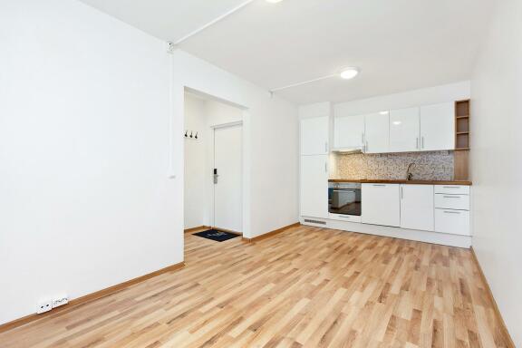 Entré, stue med åpen kjøkkenløsning, bad med opplegg for vaskemaskin, soverom og balkong.
