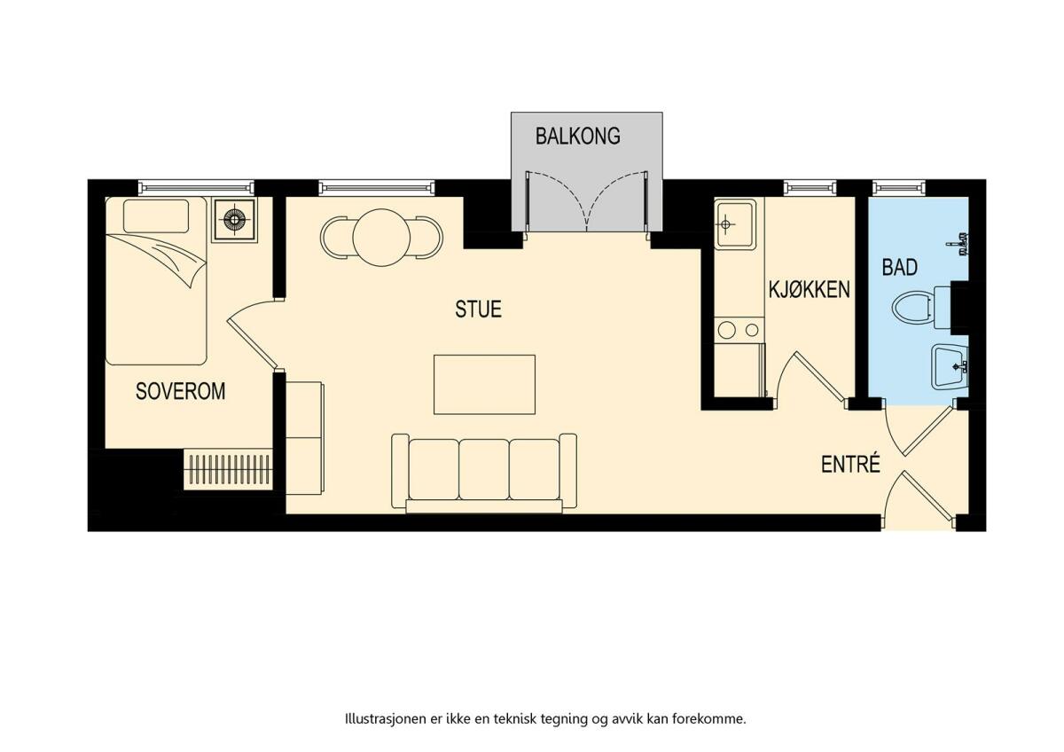 Entré, stue med utgang til balkong, separat kjøkken, bad og soverom.