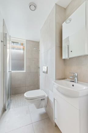 Bad: Flislagt gulv, vegger med malte flater