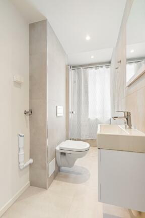 Bad: Flislagt gulv, vegger med malte flater. Opplegg for vaskemaskin.
