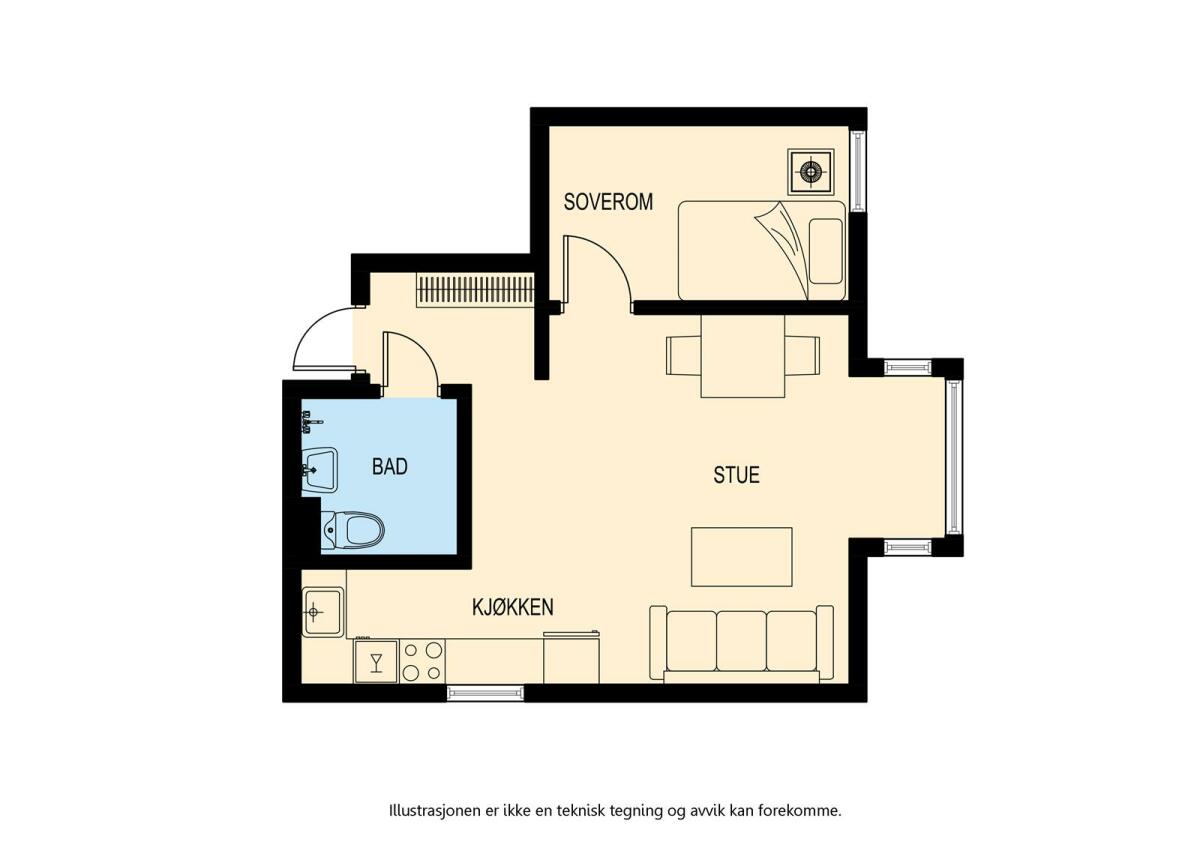 Entré, stue med åpen kjøkkenløsning, bad og soverom.