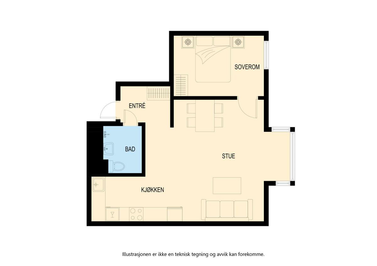 Entré, stue med åpen kjøkkenløsning, bad og soverom.