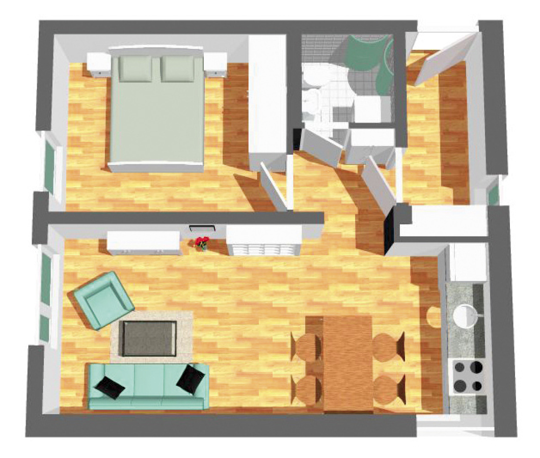Entré, stue med åpen kjøkkenløsning, bad og soverom.