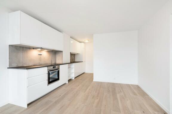Entré, stue med åpen kjøkkenløsning, 2 soverom, 1 sovealkove/kontor, balkong.