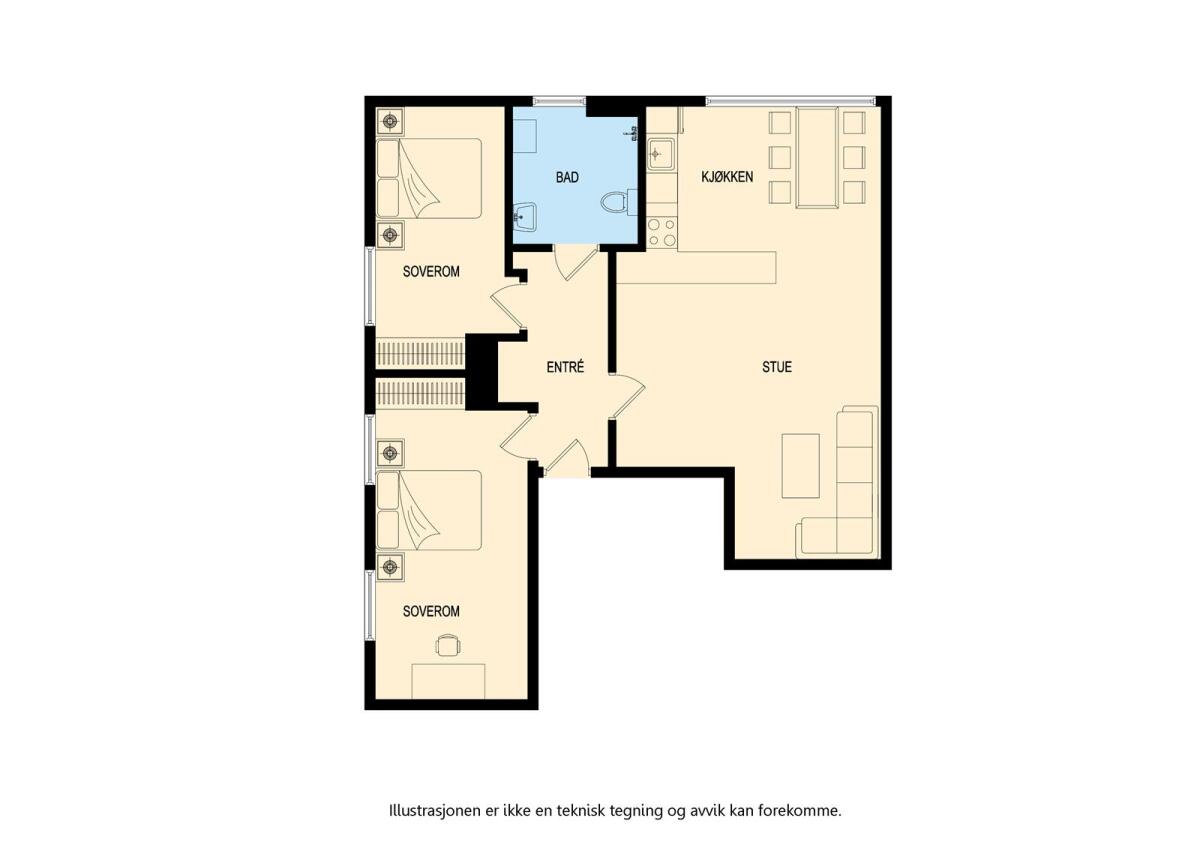 Entre, stue med åpen kjøkkenløsning, bad og 2 soverom.