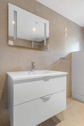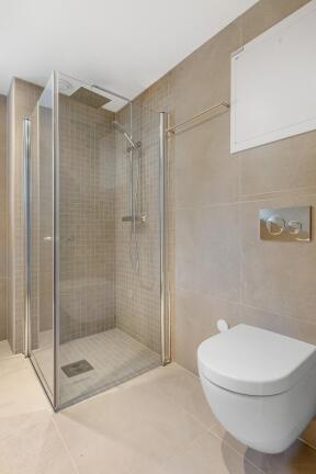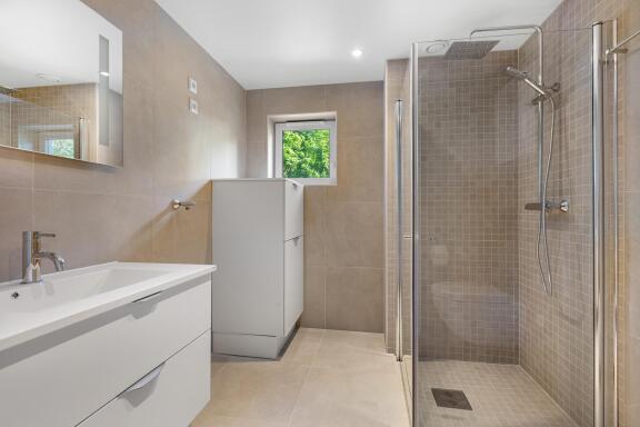 Bad: Fliser på gulv og vegger med dusjdører i glass. Dørene kan slås inn i dusjen for maksimal utnyttelse av gulvareal. Varmekabler og opplegg for vaskemaskin.