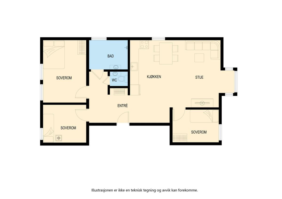 Entré, åpen stue-/kjøkkenløsning, bad, gjestetoalett og 3 soverom.