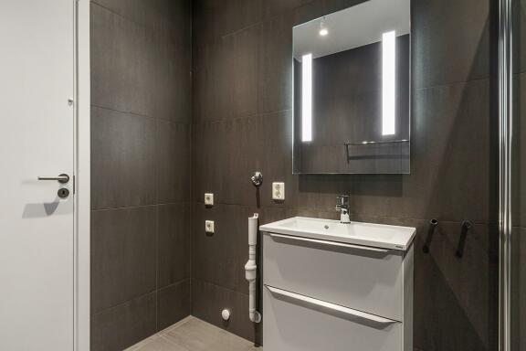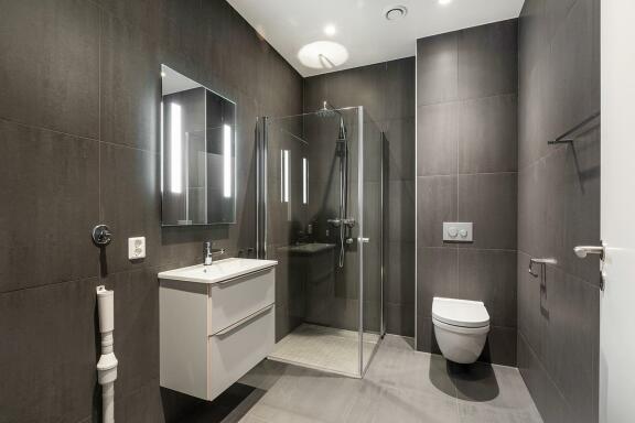 Bad: Fliser på gulv og vegger med dusjdører i glass. Dørene kan slås inn i dusjen for maksimal utnyttelse av gulvareal. Varmekabler og opplegg for vaskemaskin.