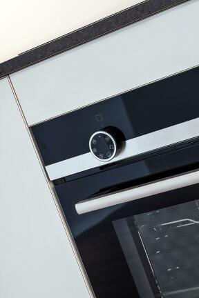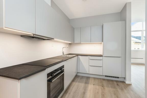 Kjøkken: Kjøkkeninnredning med integrerte hvitevarer; platetopp, stekeovn, kjøleskap med fryser, oppvaskmaskin og vifte.