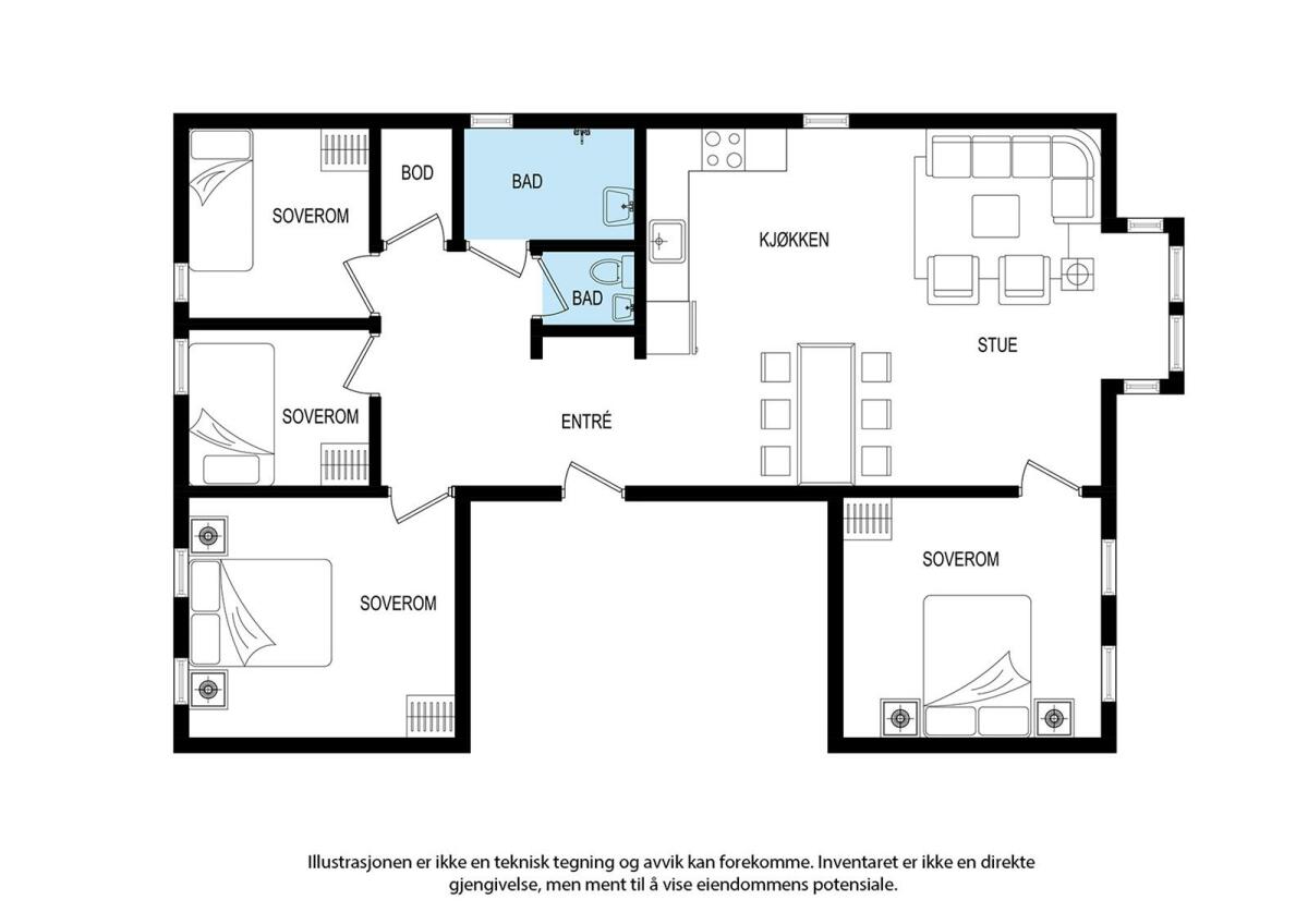 Entré, stue med åpen kjøkkenløsning, innvendig bod, bad, separat toalett og 4 soverom med god standard.