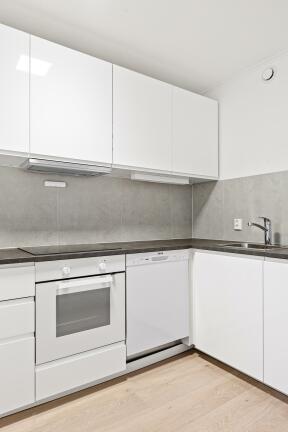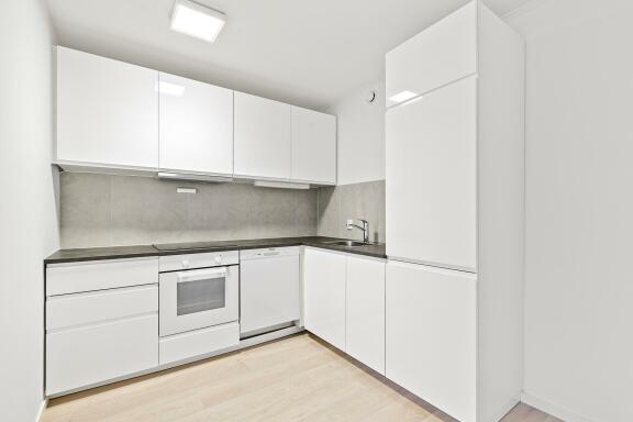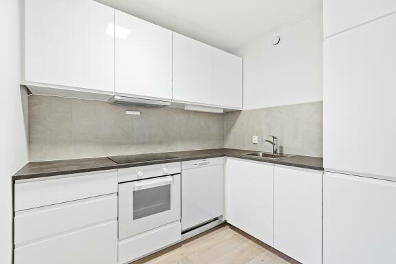 Kjøkken: Hvit innredning med god lagringsplass. Integrerte hvitevarer som induksjonstopp, stekeovn, oppvaskmaskin og kjøl-/fryseskap.