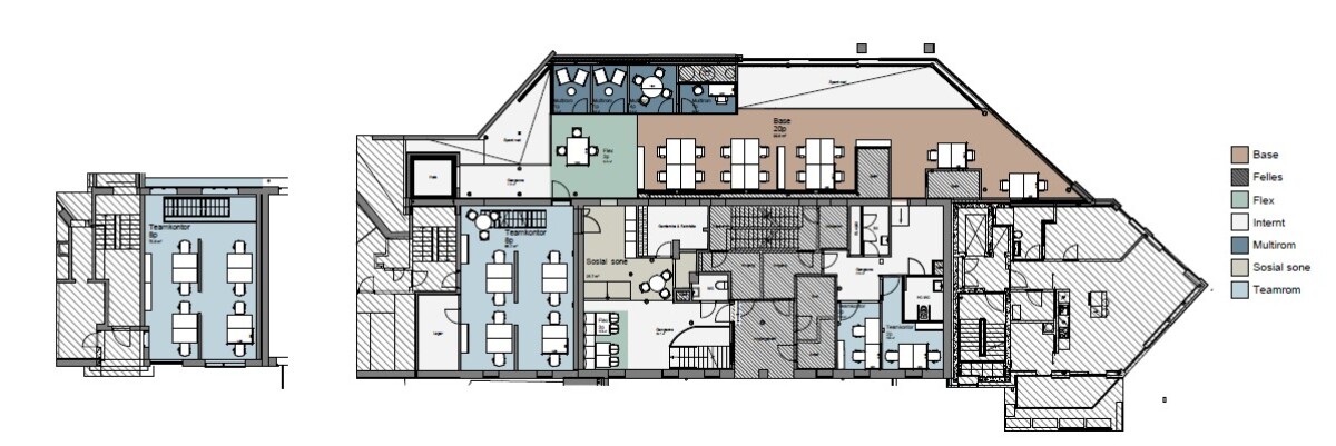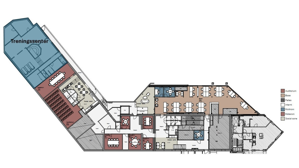 Du blir møtt av ett flott felles inngangsparti som i dag brukes som sosial sone med variert møblering samt kjøkken. Alle lokalene inneholder rikelig med støttefunksjoner derav felles møteromsfasiliteter, flere multirom i ulike størrelser, stillerom, kreative soner, større auditoriet til større arrangementer og presentasjoner samt et inspirerende treningssenter med garderobefasiliteter som kan benyttes av ansatte til alle døgnets tider.