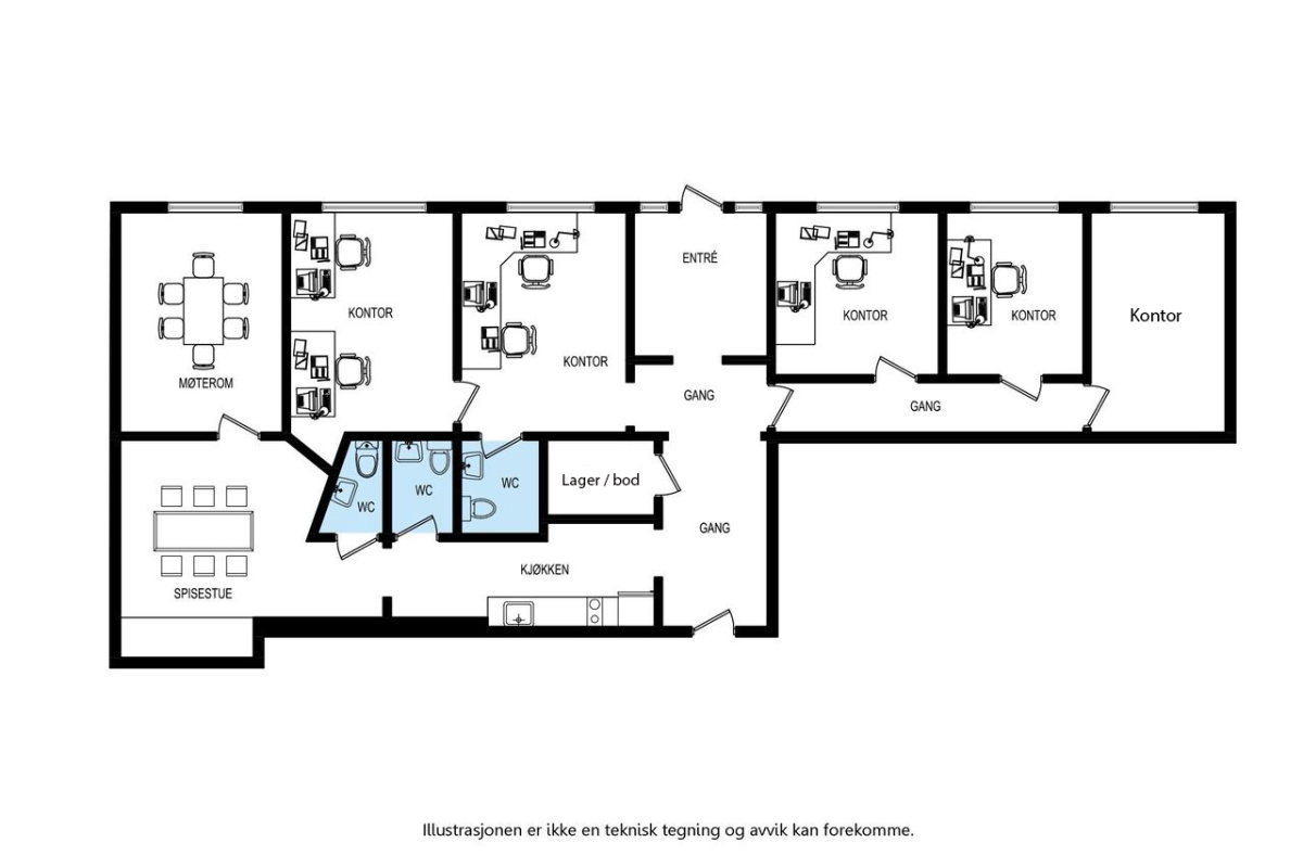 Lokalet består av 5 kontorceller, møterom, spiserom, bod og 3 separete WC.