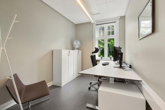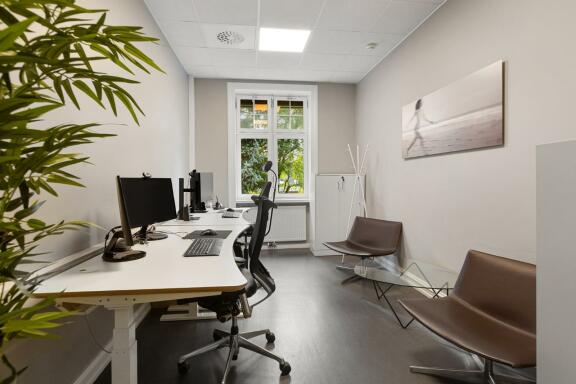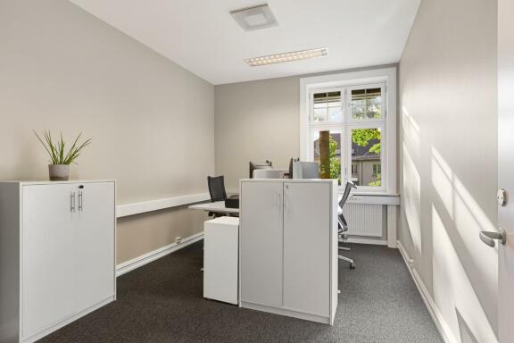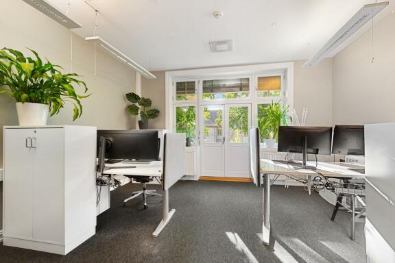 - Lyse cellekontorer i 1. og 2. etasje med store vindusflater og utsikt mot grønne omgivelser