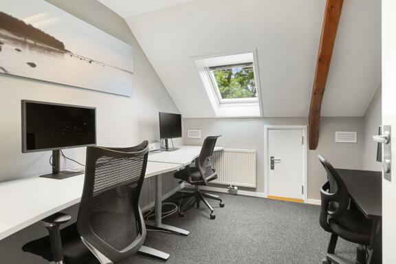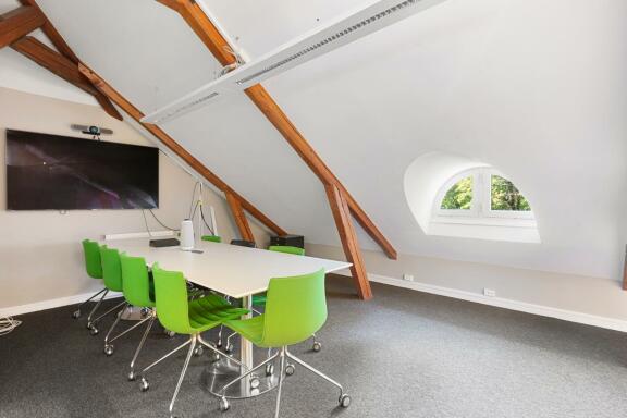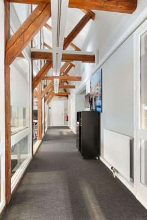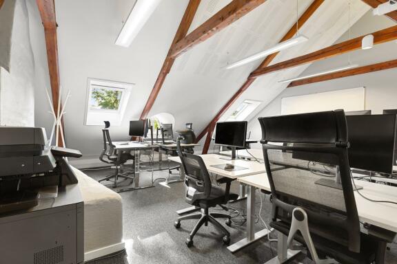 - Åpent kontorlandskap i 3. etasje med god takhøyde og synlige bjelker som gir en unik atmosfære