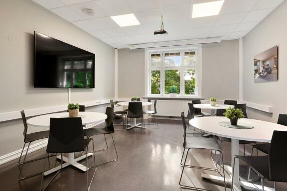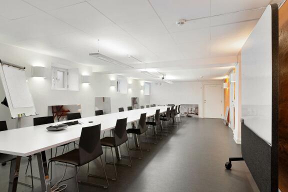 - Flere moderne møterom i ulike størrelser, fra teamrom til større møterom